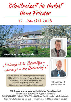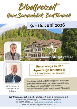 Unsere Bibelfreizeiten eigenen sich für Jung und Alt und laden ein zur Erholung für Geist, Seele und Leib. Gerne nutzen wir die gemeinsamen Stunden auch für ein intensives Bibelstudium mit Gelegenheit, Fragen zu stellen.Die angemieteten Unterkünfte reichen vom Hotel Talblick über die familiäre Pension Altes Gut im Erzgebirge bis hin zum Campingplatz auf Mönchenfrei - also für jeden etwas dabei.Anmeldungen nehmen wir gerne entgegen per Brief, Email oder auch am Telefon. Kontaktdaten s. Impressum.